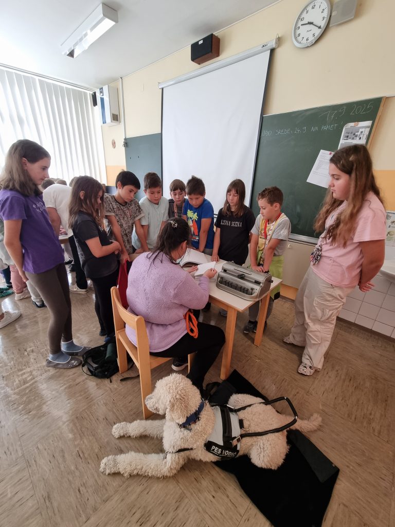 V sredo, 17. 9., so na obisk prišli člani Medobčinskega društva slepih in slabovidnih Nova Gorica. Najbolj nas je navdušil pes vodič, veliki koder Nils. Spremljala ga je vodnica Irena, ki je že od rojstva slepa. Zaupala nam je, da sta z Nilsem sama tudi že odpotovala z letalom v tujino, kar se nam je zdel, za slepega človeka, kar velik dosežek. Čeprav Irena ničesar ne vidi, nam je na Brajev pisalni stroj, zelo hitro in brez napak, natipkala naša imena.