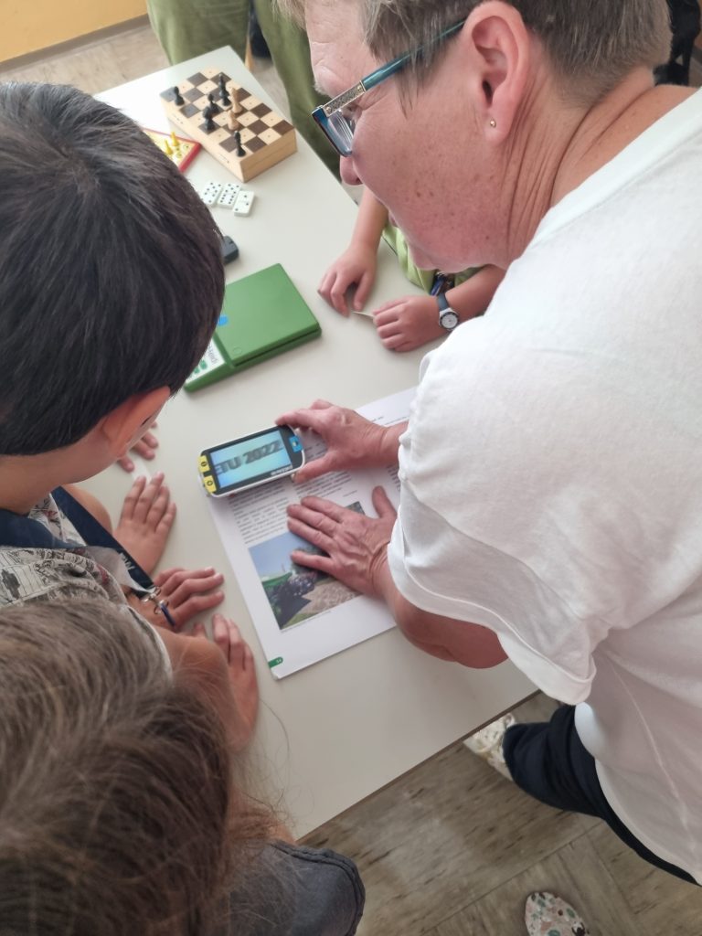 Poleg Irene sta nam veliko zanimivih pripomočkov pokazala tudi Peter in Lucija. Lucija je slabovidna oseba, kar pomeni, da tudi z očali ne vidi dobro. Videli smo časopis v brajici, kartonke za slepe otroke, družabne igre in druge pripomočke prilagojene slepim in slabovidnim.