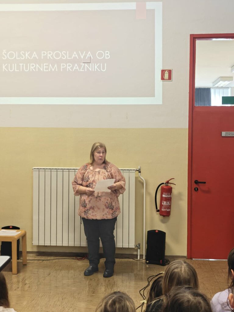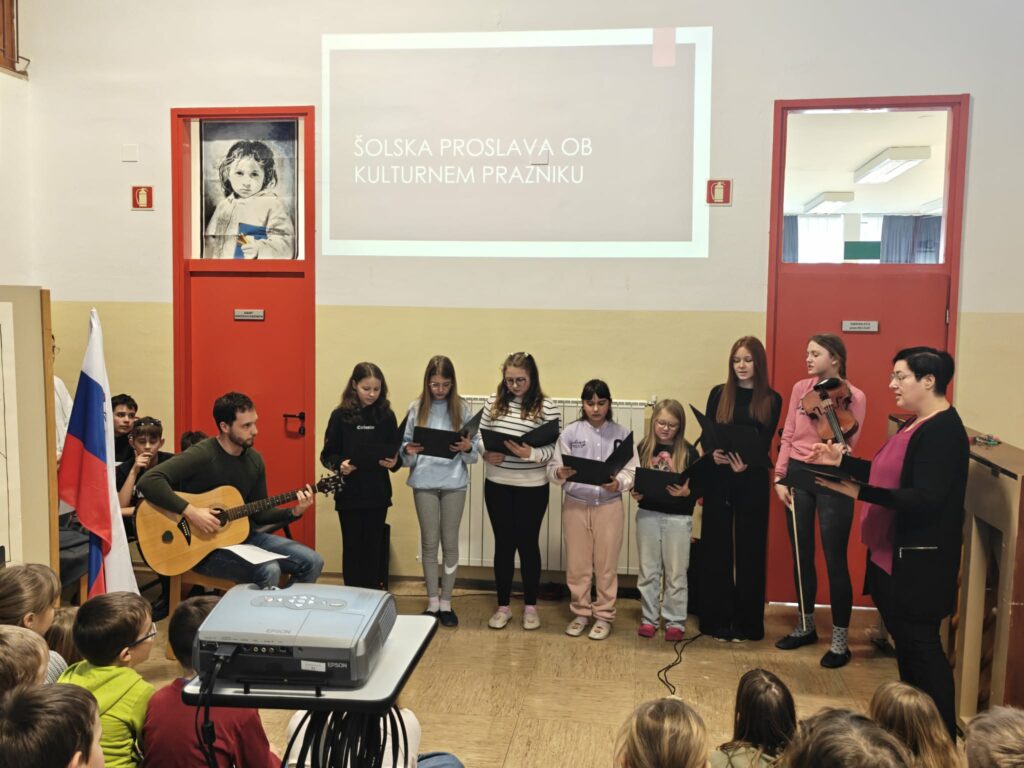 Program so obogatili še recitacija sedme kitice Zdravljice v angleškem jeziku, dve sodobni pesmi – Prebesedimo besede in Zimski športi – ter ubrano petje šolskega pevskega zbora s pesmijo O Vrba. Dogodek se je zaključil z nagovorom ravnateljice.